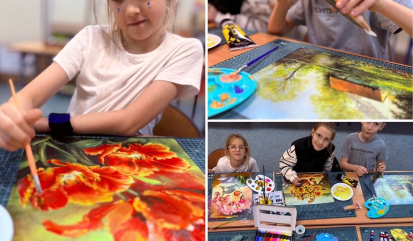 W Mobilnej Pracowni Plastycznej jak zwykle kolorowo i… nieco brudno. Ale tak bywa, gdy farby są motywem przewodnim. Pracowaliśmy na bazie starych reprodukcji.