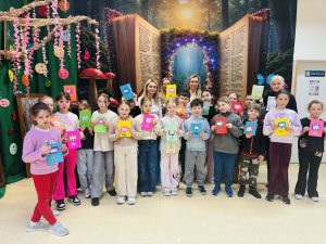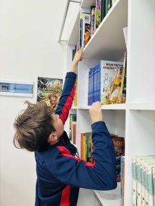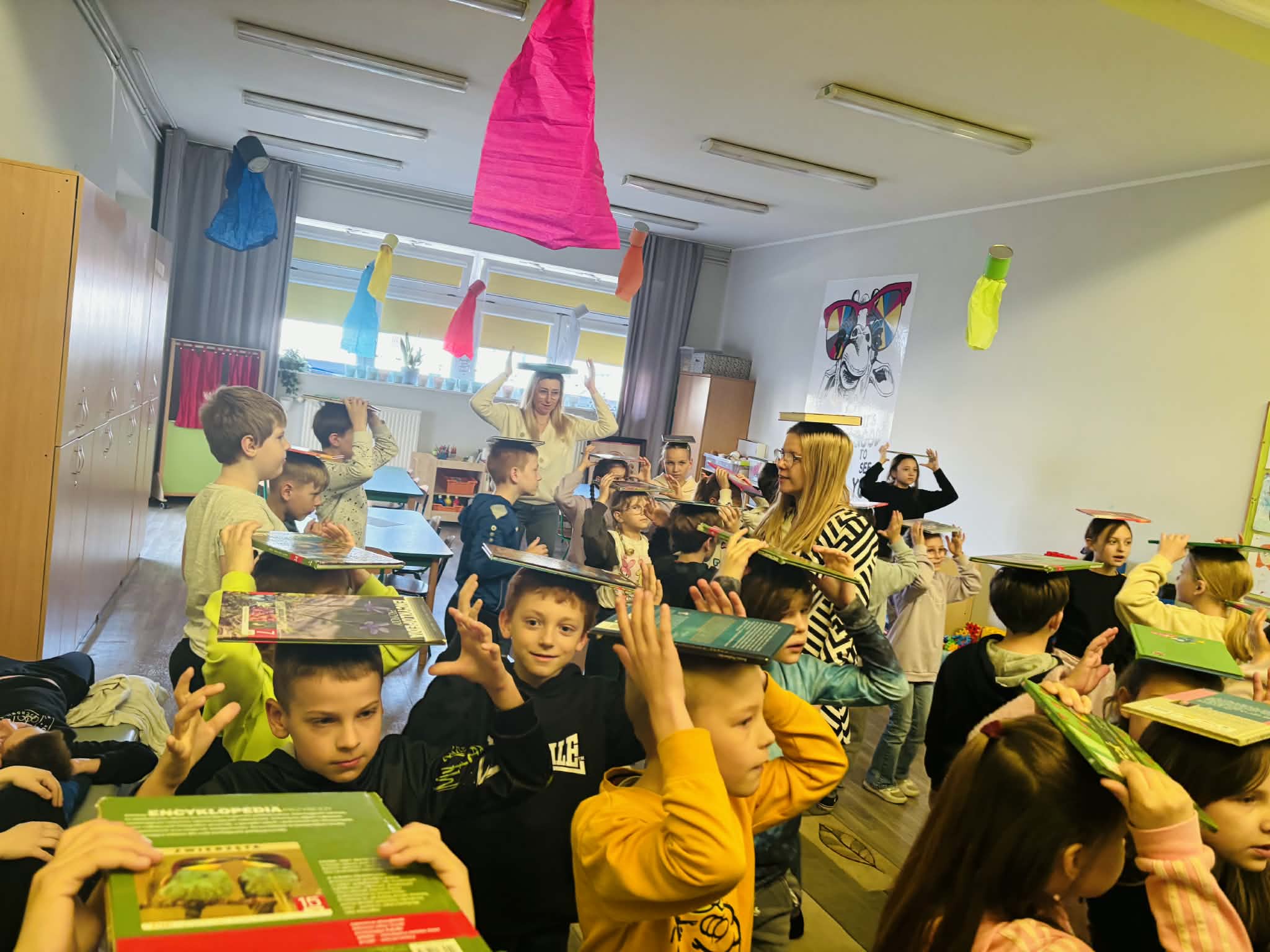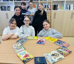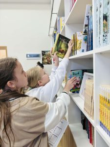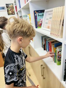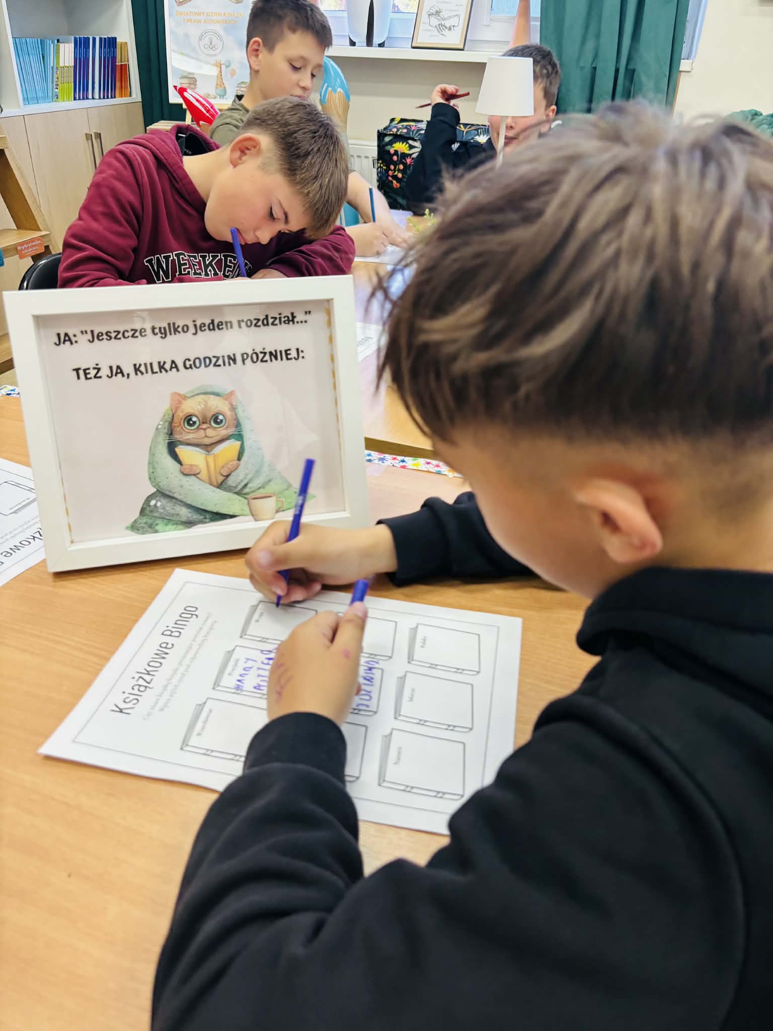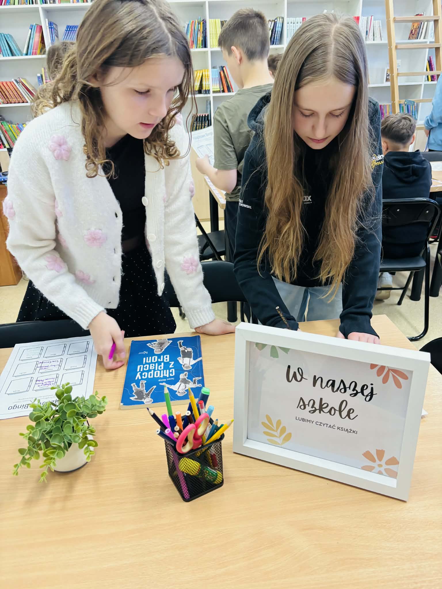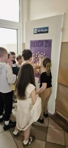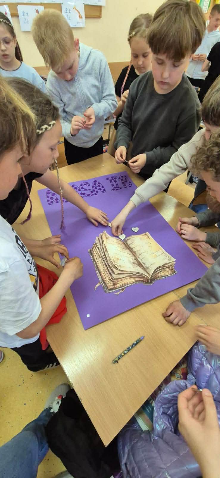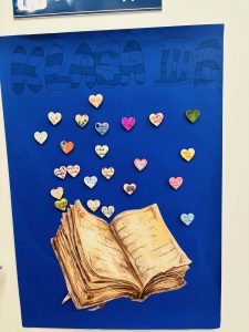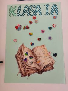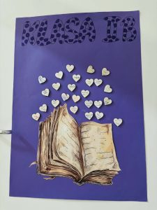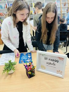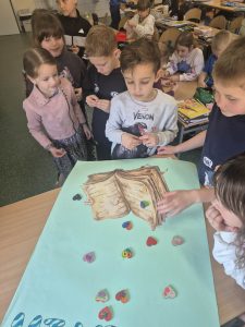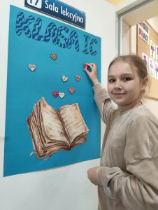 Z okazji Światowego Dnia Książki i Praw Autorskich nasza szkoła zamieniła się w prawdziwie literacką przestrzeń pełną inspiracji i dobrej zabawy 📖✨  Najmłodsi czytelnicy z zainteresowaniem słuchali bajkowych opowieści o książkach, a także brali udział w literackim kole fortuny. Dzieci przygotowywały piękne laurki, „kwiatki dla książki”, a także wyjątkowe serduszka       z życzeniami 💛 Każda klasa dołożyła swoją cegiełkę, tworząc wspólny plakat pełen ciepłych słów skierowanych do książek.  Nie zabrakło również prezentacji przybliżającej istotę tego święta oraz wspólnego tworzenia i projektowania kącików czytelniczych.  Starsi uczniowie zmierzyli się z wyzwaniem w postaci „książkowego bingo 📚” – wyszukiwali w bibliotece książki pasujące do określonych motywów, takich jak: przyjaźń, natura czy morze, podając ich tytuły i autorów.         Wielu z nich podjęło się także napisania recenzji swojej ulubionej książki.  Dodatkową atrakcją była zamiana ról – jedna z uczennic wcieliła się w rolę pani bibliotekarki, co spotkało się z dużym zainteresowaniem i uśmiechem uczniów 😊 To był dzień pełen kreatywności, zaangażowania i prawdziwej radości z czytania!
