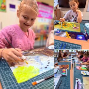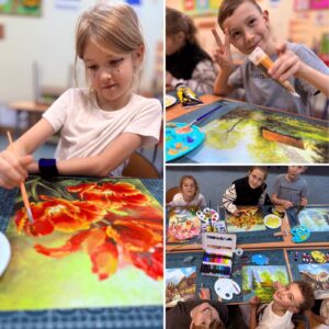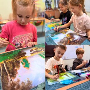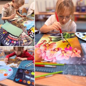 W Mobilnej Pracowni Plastycznej jak zwykle kolorowo i… nieco brudno. Ale tak bywa, gdy farby są motywem przewodnim. Pracowaliśmy na bazie starych reprodukcji.