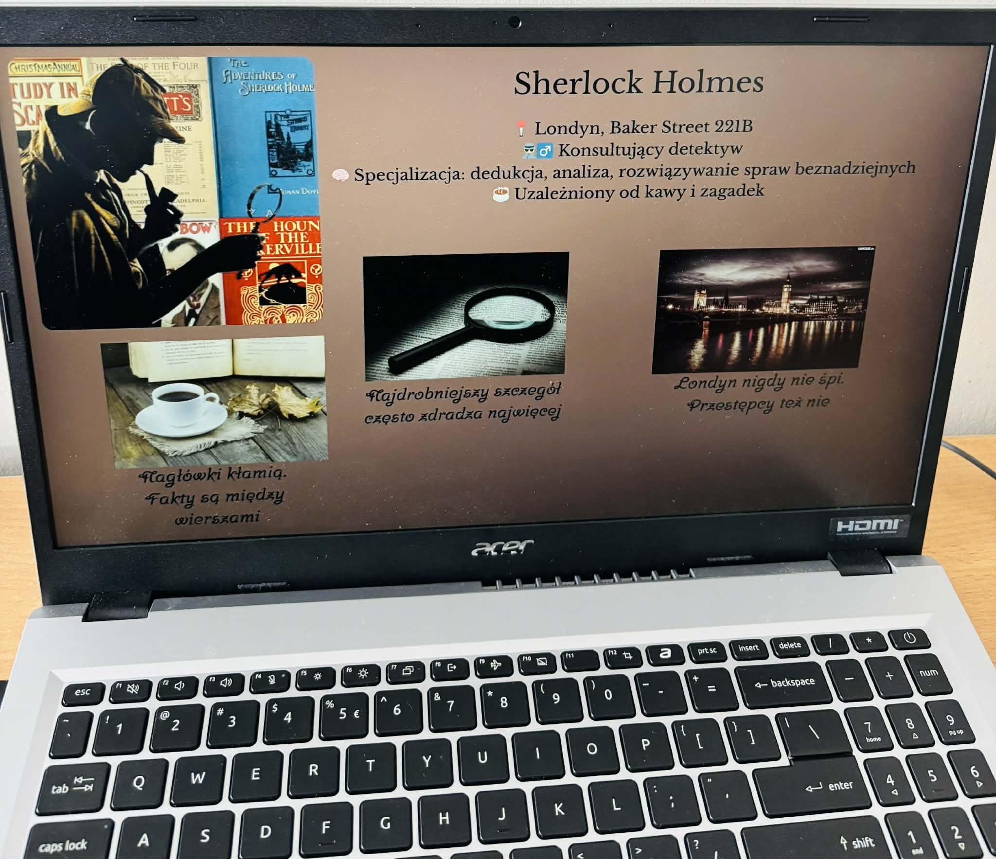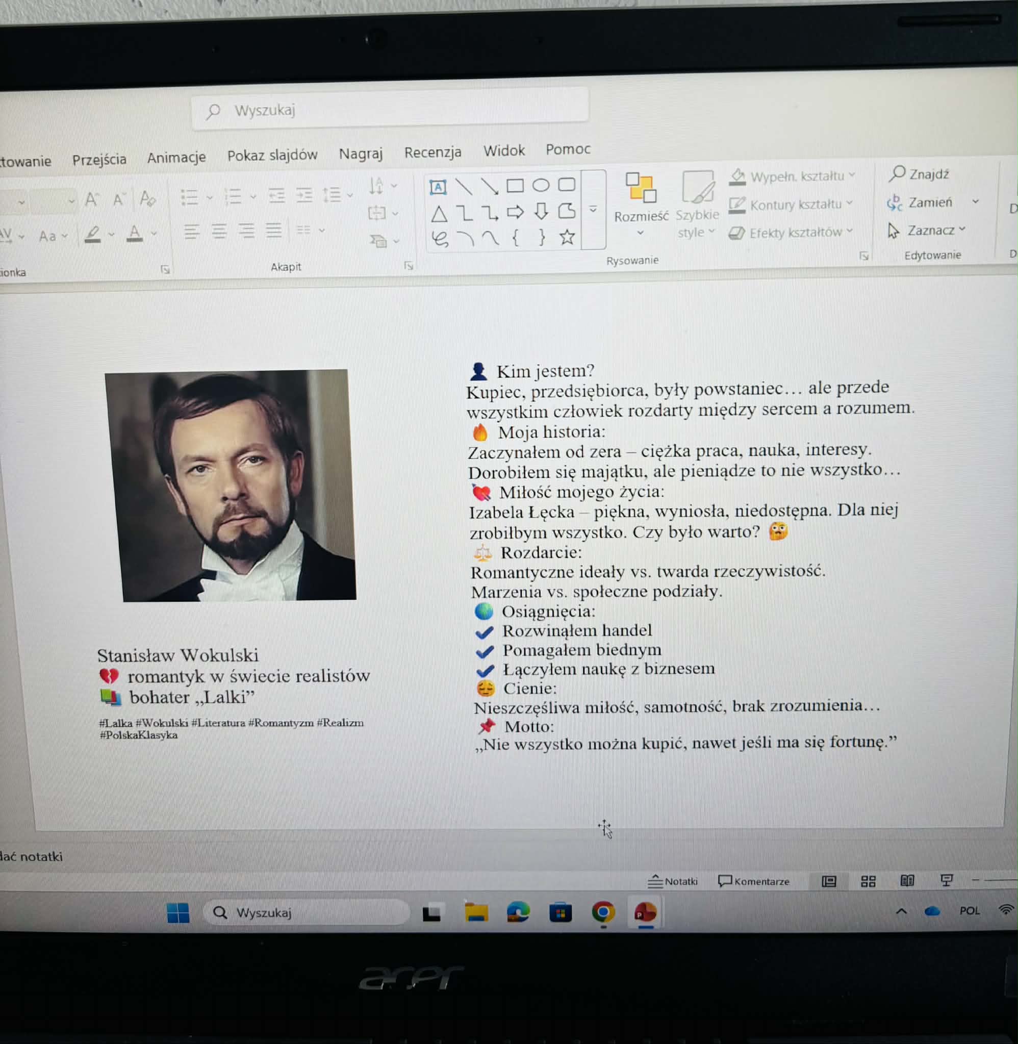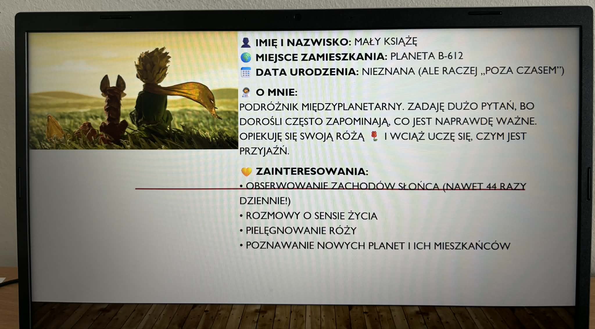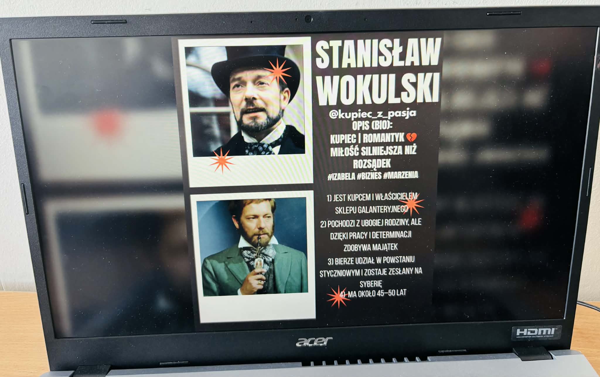 Uczniowie samodzielnie tworzyli profile swoich ulubionych bohaterów literackich, wzorując się na popularnych platformach, takich jak Facebook czy Instagram. W swoich projektach przedstawiali najważniejsze informacje o postaciach, ich cechy, zainteresowania oraz wydarzenia z ich życia.